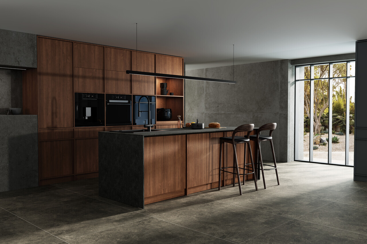 Die Steinoptik der Rückwand bildet einen Kontrast zu den schwarzen Schränken und erzeugt Tiefe und visuelle Spannung. Der Einsatz von Holz bei der Kücheninsel bringt natürliche Wärme und gleicht die Farbpalette harmonisch aus.